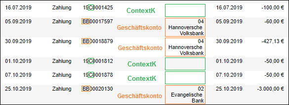 Ebenfalls ist die Unterscheidung an der Belegnummer zu erkennen. Buchungen vom Geschäftskonto fangen immer mit BB an, Buchungen über ContextK mit der Jahreszahl und einem C für ContextK: