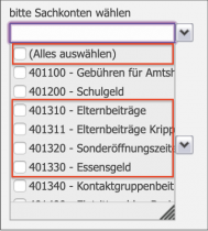 Sie haben bei einigen Berichten bspw. die Möglichkeit, entweder alle Sachkonten auszuwählen oder nur bestimmte. Möchten Sie in diesem Beispiel alle Sachkonten auswählen, reicht es auf (Alle auswählen) zu klicken. Gleichermaßen können Sie über diese Auswahl, sollten alle Sachkonten ausgewählt sein, mit einem Klick darüber auch alle deaktivieren, um nur einzelne auszuwählen.