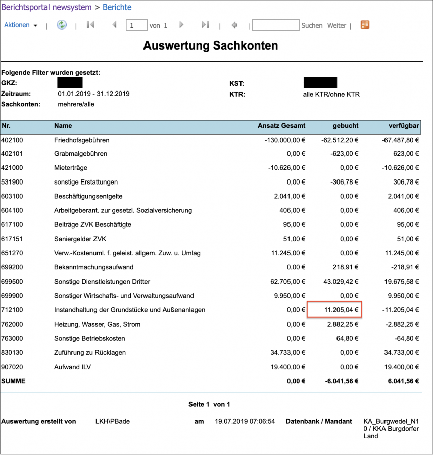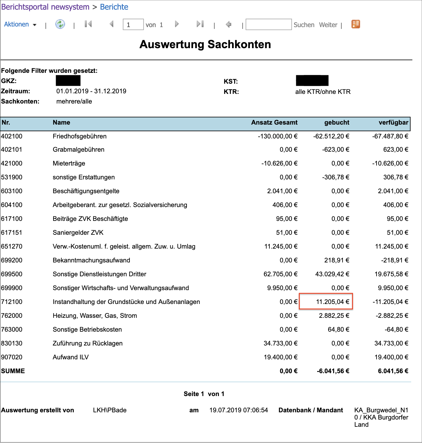 Anschließend wird Ihnen der Bericht in der linken Seitenhälfte dargestellt. Bei einigen Berichten können Sie zum Beispiel auch direkt auf den Betrag in der Spalte gebucht klicken, um noch weitere Detailangaben zu erhalten.