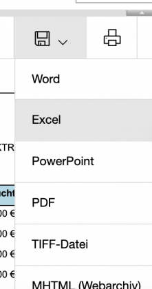 Über den oberen Bereich und der Schaltfläche Speichern (= Diskettensymbol) können Sie den Bericht auch als PDF, Excel oder in andere Dateiformate exportieren.