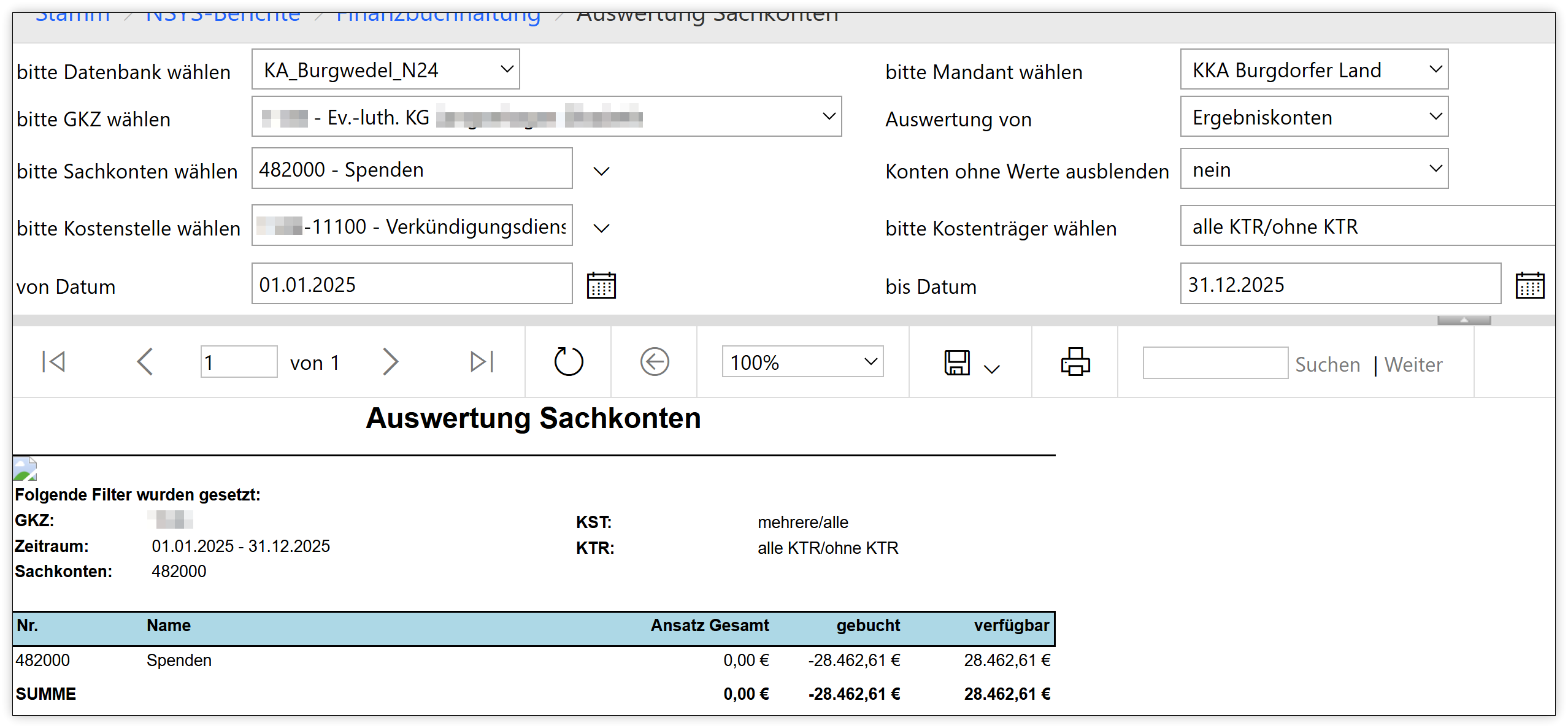 Den Bericht finden Sie über die Webberichte, wenn Sie die Kacheln NSYS-Berichte und anschließend Finanzbuchhaltung anklicken. Danach heißt der Bericht Auswertung Sachkonten. Mit diesem können Sie auf Ebene der Sachkonten einzelne Buchungen anzeigen lassen. Er eignet sich somit bspw. auch dafür zu sehen, welche Zahlungseingänge auf den Sachkonten für Spenden und Kollekten gebucht wurden.