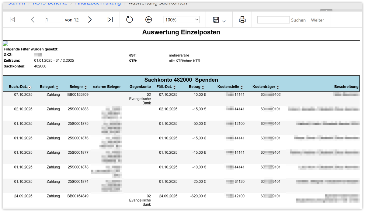 Der Bericht dient der Auswertung aller Sachkonten mit einzelnen Buchungen auf dem Sachkonto. Die Sortierung erfolgt automatisch nach dem Buchungsdatum und enthält auch Angaben zum Gegenkonto (Mittelgeber/Mittelempfänger).